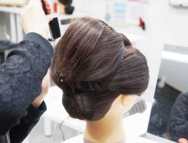 新日本髪は、これまで学んできたヘアアレンジの中でもとても高度な技術ですが、日本人ならではの着物に一番似合うスタイルです。着物を着る機会は減っていますが、成人式、結婚式、七五三と、様々なシチュエーションで求められるスキルでもあります。成人式などは、早朝からヘアセットの予約が連続して続く場合も多いので、スピードも求められます。